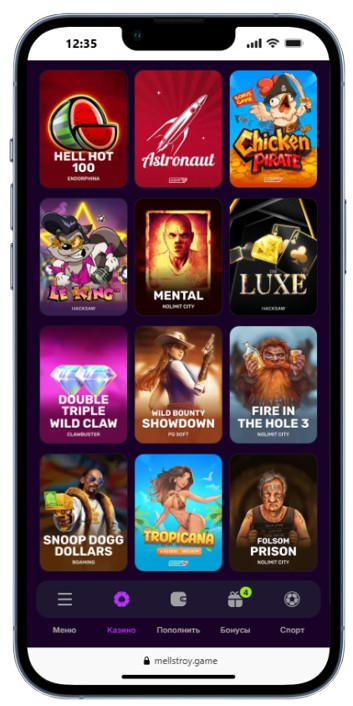 Раздел слотов – самый популярный в нашем казино. Мы предлагаем в Mell stroy game играть в классические автоматы, современные видеослоты с 3D-графикой и игры с механикой Megaways. Слоты Мелстроя отличаются высоким RTP (процентом возврата игроку) и разнообразием бонусных функций, таких как покупка бонуса и фриспины.